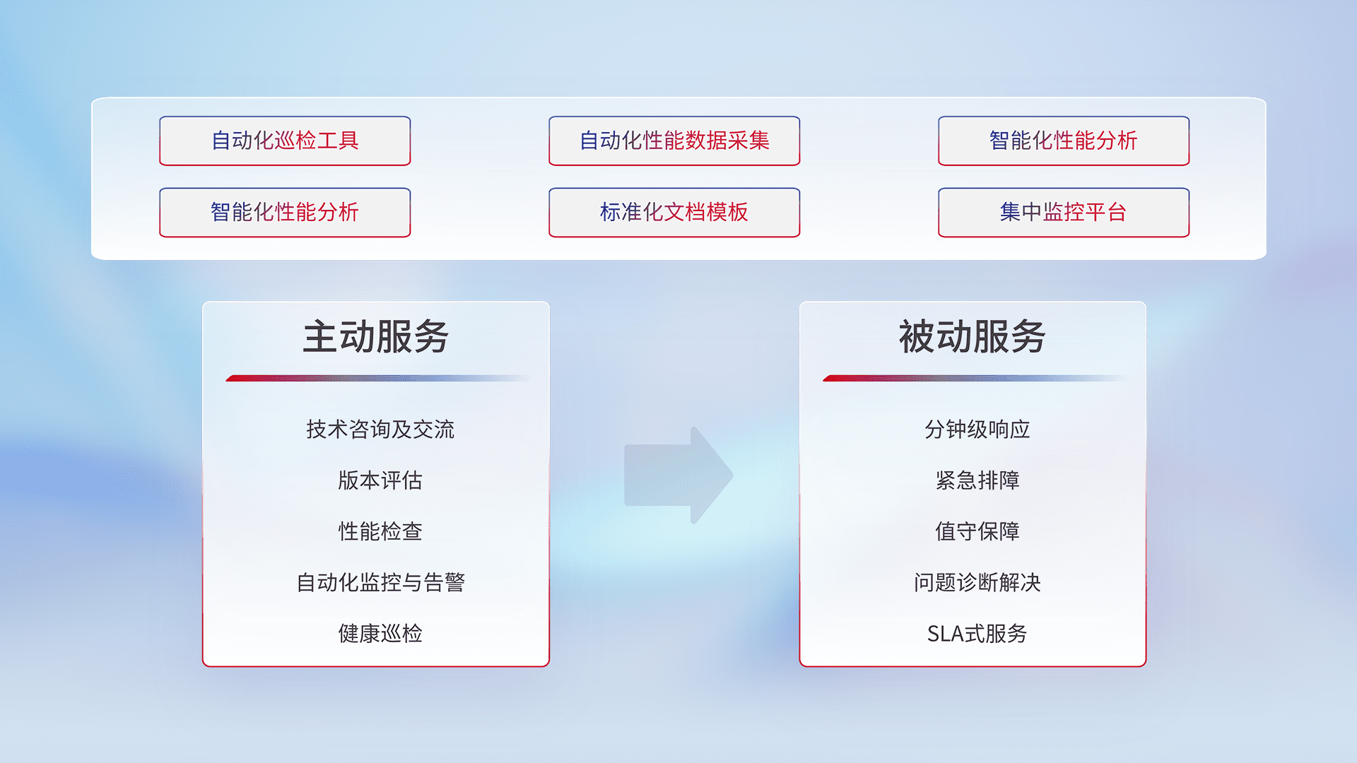 智能化工具和标准化文档,,,,保障服务质量,,,提供主动服务(包含技术咨询、、版本评估、、性能检查、、、自动化监控与告警、、、健康巡检)和被动服务包含(分钟级响应、、、紧急排障、、、值守保障、、、、问题诊断解决、、、、SLA服务)。。。